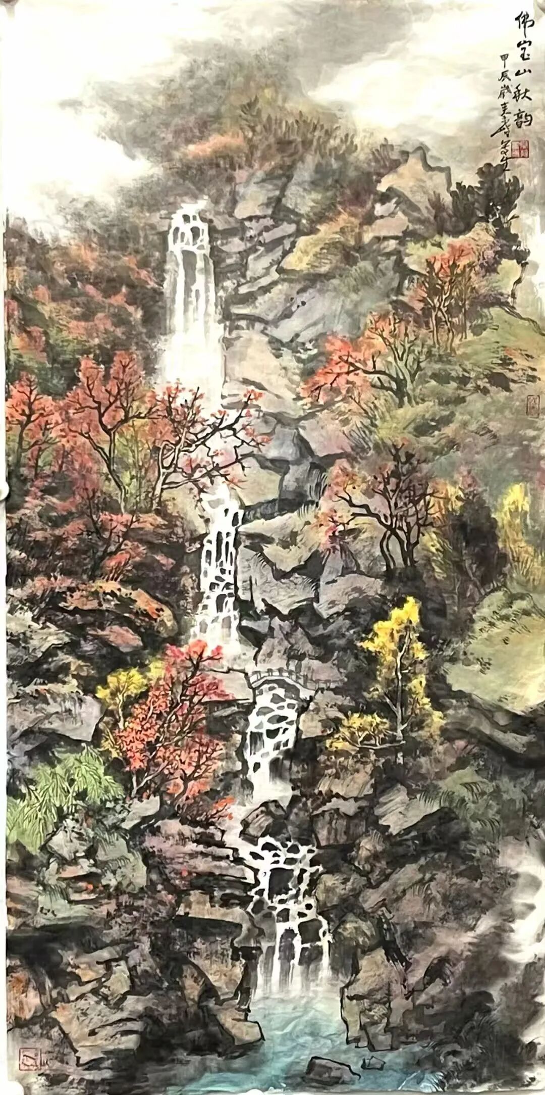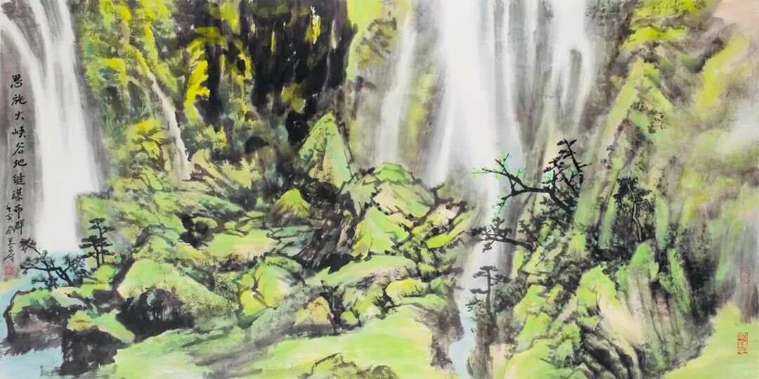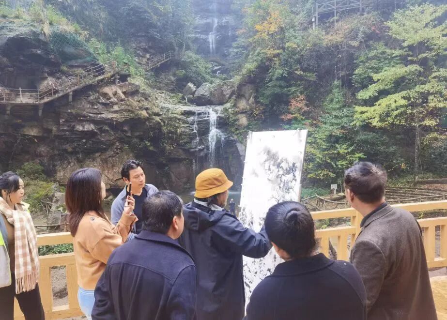 秦岭教授对恩施的热爱并未止于此,他五临利川市佛宝山写生,决心创作佛宝山四季图。他以笔为舟,在春山的新绿里泊过诗意,那一抹嫩绿,仿佛是大自然的诗行;于夏瀑的轰鸣中蘸取豪情,瀑布的飞流直下,如同他心中的激情澎湃;从秋林的丹霞间拾得醇厚,那五彩斑斓的秋林,是大自然馈赠的醇厚美酒。如今,春、夏、秋三幅作品已完美呈现,而冬景待绘。这留白之处,恰似天地的邀约,邀请每一位旅人踏雪而来,去领略墨色与琼花共舞的美妙,去聆听松涛与冰瀑同吟的和谐。当冬雪的清洌被收进卷轴,佛宝山的四季便完整地展现在人们面前,春可寻幽,夏宜观瀑,秋能赏叶,冬尽品寒。这里的每一笔色彩,都是自然与人文的交响;每一季风光,都呼唤人们走进画里,感受文旅相融的暖意,让这份美好在山水长卷中生生不息。