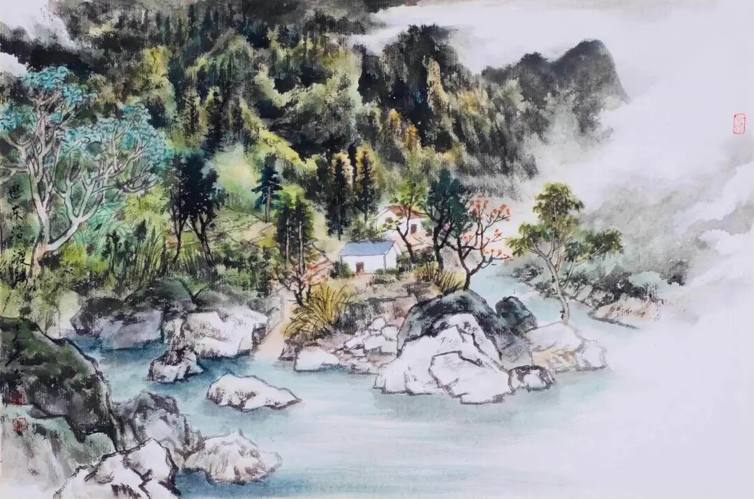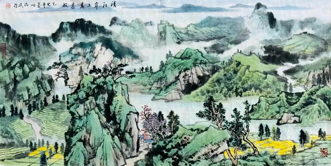 秦岭与恩施的情缘,是从第一眼撞见山间漫溢的绿开始的。那绿不是单薄的色彩,是清江水波里揉碎的翡翠,是武陵山脉间层叠的青黛,是土苗村寨旁缠绕的藤蔓。自此,这方土地的绿便浸进了他的骨血——春到恩施,他追着映山红的足迹,踏遍苏马荡;夏临清江,他守在船头捕捉晨雾漫过峡谷的光影;秋染枫香坡,他蹲在田埂记录稻浪与彩林的交织;冬覆齐岳山,他裹着棉衣描摹雪压松枝的苍劲。这份情缘,早已不是简单的遇见,而是画家与山水的灵魂相识。